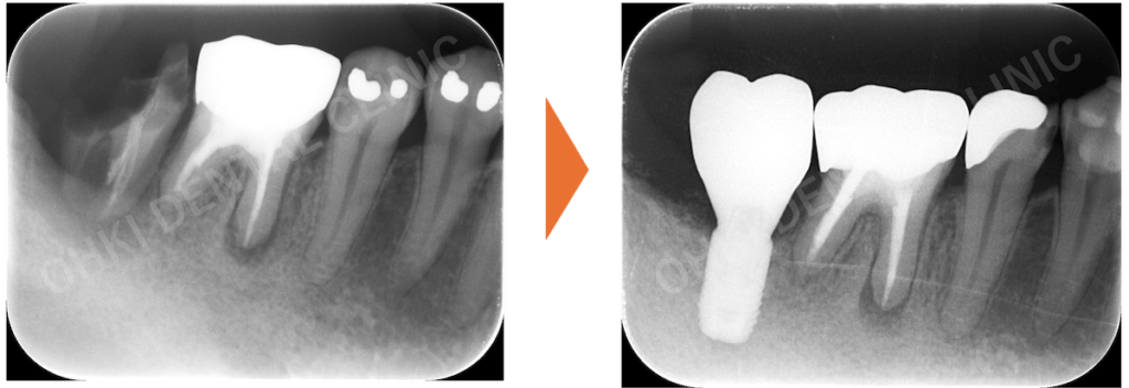 インプラント治療によって、重度の歯根破折を伴う欠損部位に噛み合わせを支える柱を再建し、残存歯の健康寿命を延ばした症例をご紹介します。