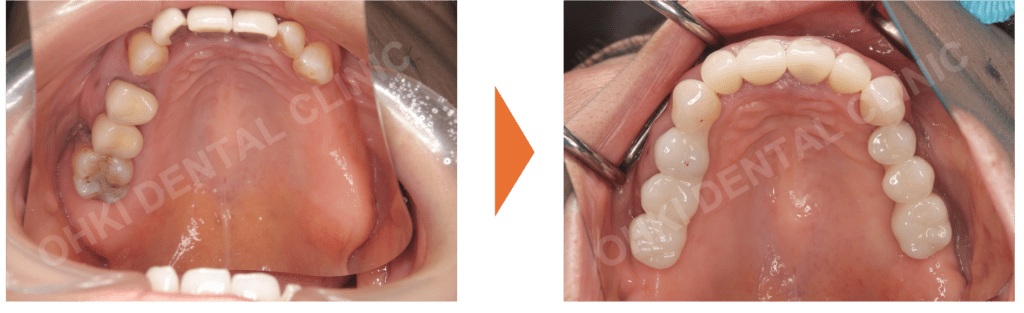 まずは不適合な被せ物の除去と仮歯への置き換え、徹底した歯周基本治療(TBI、スケーリング、SRP)を行い、「残せる歯」と「抜歯すべき歯」を明確に選別しました。 - 上顎の再建: