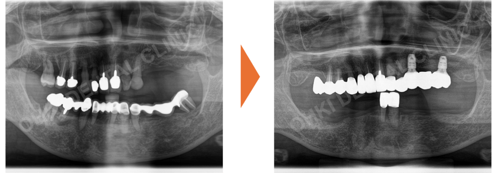 ・不適合な補綴物(被せ物)が多数あり、残っている歯も歯周病で保存が難しいものが含まれていました。