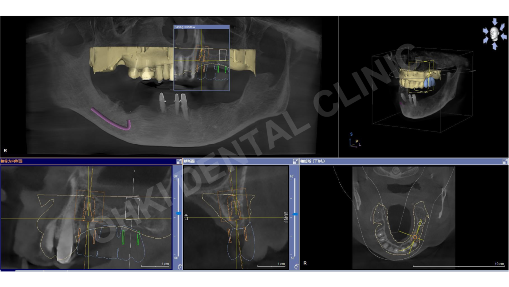 左上奥歯にはインプラントを埋入して垂直的な噛み合わせを支え、それ以外の部分はセラミックブリッジによる固定式での再建を選択しました。 - 下顎の再建: